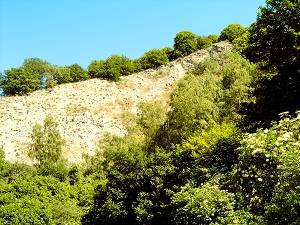 | Naturschutzgebiet Pfanne / Pfannenspring Die Pfanne liegt ca. 0,6 km nördlich des Einganges der Barbarossahöhle. Sie kann als eine der eindrucksvollsten übertägigen Karstformen des mitteldeutschen Zechsteins angesehen werden. Auf einer Grundfläche von annähernd 100 x 100 m ist der nordwestlichste Teil des Bergsporns der Falkenburg nahezu vollständig der Verkarstung anheimgefallen. Eine nach Westen und Norden flach ausklingende Mulde wird südlich und östlich durch etwa 60 m hohe Steilwände begrenzt. Am Muldentiefsten befindet sich der Quelltopf des Pfannensprings. Die Flurbezeichnung "Pfanne" sowie der Name "Pfannenspring" (auch: A[h]rensbrunnen) dürfte aus dem Zusammenhang mit den Wasserrechten der Frankenhäuser Saline an der Quelle abzuleiten sein (von Pfanne = Siedetrog; Pfannerschaft).