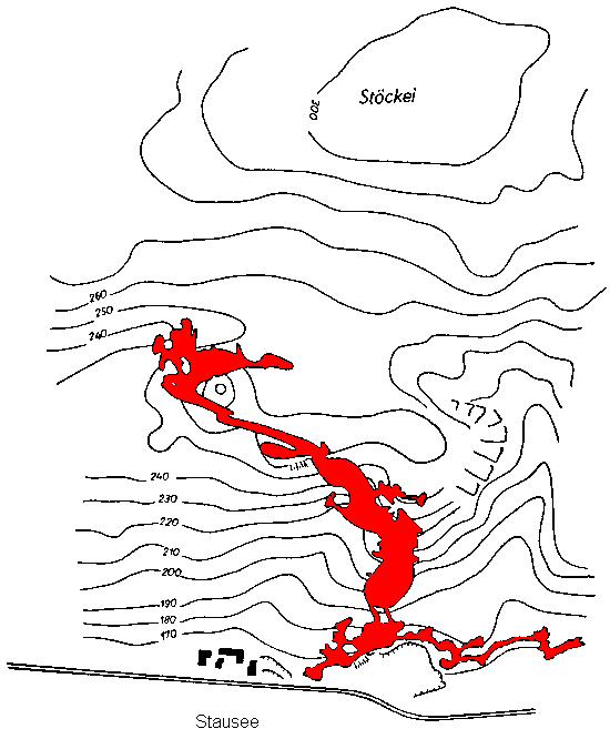 So fielen Brunnengalerien trocken und letztendlich versuchte sich auch das Wasser des Kelbraer Stausees einen Weg in die Tiefe zu bahnen, da die darunterliegenden, sonst grundwasserführenden Schichten, ebenfalls entwässert wurden. Damit wurde klar, daß das Betreiben weiterer Wasserhaltung im Kupferschieferbergbau in diesen Dimensionen nicht mehr aufrecht erhalten werden konnte. Das sogenannte Westfeld des Grubengebäudes des Thomas-Müntzer-Schachtes wurde abgeriegelt und man stellte die Wasserförderung und den Bergbau in diesen Feldesteilen ein. Daraufhin stellte sich der alte Karstwasserspiegel innerhalb weniger Monate wieder ein und man konnte das Wasser in der Höhle ansteigen sehen. Es dauerte nur wenige Wochen und die große Höhle war für alle weiteren Zeiten der Nachwelt entrückt. Der Wasseranstieg erfolgte teilweise so schnell, daß nicht mehr alle Arbeiten abgeschlossen werden konnten und ein Teil der Ausrüstung in der Höhle verblieb. Befahrungsbericht " ... Am 20. Oktober 1988 weilte der Biologe Rolf Eckert aus Berlin am Karstmuseum. Er arbeitete an der Feststellung der Spinnenfauna der Harzer Höhlen. Da im Eingangsbereich der Höhle sehr viele Spinnen lebten, führten wir ihn an diesem Tage zur Numburghöhle. Dieter Marquardt sollte ihm bei der Arbeit helfen. Christel und Reinhard Völker, sowie Karl-Heinz Schmidt waren mit einem neuen Schlauchboot ausgerüstet und hatten sich das Ziel gestellt, den geheimnisvollen Höhlensee zu überqueren. Das Boot wurde mit Mühe an die Abstiegsstelle geschleift und bereits ausgepackt, als der erste feststellte, daß es in dem im August entdeckten See gar kein Wasser mehr gab. Der Wasserspiegel war durch das anhaltende Pumpen des Schachtes weiter abgesenkt worden. Nun packte uns das Entdeckerfieber... Rolf und Dieter wurden herbeigerufen. Ralf vergaß sofort seine Spinnen. Der "See" war völlig leer. Wir betraten eine geräumige Halle. Der Boden bestand aus bizarrstem Anhydritschutt. Die Oberfläche der sehr labil gelagerten Trümmer war mit einer feinen und nassen Schlammschicht überzogen. Es war sehr schwierig und anstrengend, einen sicheren Stand auf diesem. Material zu bekommen. Wir tasteten uns immer am Rande der Halle entlang. An der hangwärts liegenden Begrenzung des Raumes stiegen wir ständig über von außen einfließende Trümmermassen und Schlammberge. Wir kannten das Spaltensystem von außen, das also war die Verbindung zur Höhle. Zwei tunnelartige Fortsetzungen führten weiter nach unten. Die Schlammassen waren aber noch so naß, daß wir darin versanken. Anfangs floß der Schlamm nur oben in die Stiefel hinein, bald aber mußten wir uns gegenseitig aus dem Schlamm herausziehen. Man konnte kein Bein mehr bewegen. Wir hatten Angst, im uferlosen Morast zu versinken. Mehrere Gänge trennten sich. Eine unsägliche Entdeckerfreude bemächtigte sich unserer. Überall ging es weiter. Die Querschnitte der Gänge waren so groß, daß man immer aufrecht weiter laufen konnte. Reiner versank in einem Gang bis zu den Hüften im Schlamm. Er mußte sich ausgraben und mit Mühe auf einen nackten Felsblock ziehen. In dieser Richtung ging es also zur Zeit nicht weiter. Aber rechter Hand gab es auch einen großen Gang. Der zähe Schlamm ließ uns kaum noch vorwärtskommen. Aber da verlor sich plötzlich das Licht unserer Lampen in der Dunkelheit. Ein riesiger Raum zeigte sich, die Halogenlampe konnte nur ein schwarzes Loch zeigen. Mit viel List und Tücke überwanden wir die letzte Schlammstelle, die uns fast in die Tiefe zu ziehen drohte. Aber das konnte uns nun nicht mehr aufhalten. Bald standen wir am Anfang eines riesigen Domes, am Fuße einer meterhohen Verbruchshalde. Blöcke von mehreren Kubikmetern und kleinstückiger Verbruch häuften eine riesige Halde auf. Auch jüngster Verbruch, wenige Stunden alt, lag mit frischen Abrißflächen auf morastigem Untergrund. Nach ehrfurchtsvollem Staunen und Bemustern der Wände nach weiteren möglichen Verbruchsereignissen tasteten wir uns auf diesem Berg weiter. Auch hier war der Verbruch mit einer feinen Schlammschicht überzogen. Der Schlamm machte das Besteigen des Berges zu einer schwierigen Angelegenheit. Alles an uns war morastig, man konnte kaum noch die Füße heben. Es war so glatt, daß man sich kaum halten konnte. Am besten war es, sich auf allen Vieren zu bewegen. Viele Blöcke lagen im Gleichgewichtszustand. Schon ein Anfassen brachte sie zum Umstürzen. Durch die Lage im Wasser waren sie an der Unterseite total korrodiert. Sie besaßen keine Auflagefläche mehr. Selbst festliegende Steine brachen durch das Gewicht beim Begehen in sich zusammen. Jeder Schritt mußte überlegt werden. Als wir den Trümmerberg bestiegen hatten, wölbte sich über uns eine Kuppel von gut 12 m Höhe. Auch der Trümmerberg selbst hatte diese Höhe. Der Raum war somit etwa 25 m hoch und hatte einen Durchmesser von gut 40 Metern. Der ungeheure Verbruch brachte dem Raum spontan den Namen "Chaosdom" ein. Ein Abstieg vom gegenüberliegenden Teil des bestiegenen Trümmerberges war unmöglich. Dort stand noch Wasser und gab keinen Weg frei. Aber in einer Wand war eine canonartige Schlucht sichtbar. Diese war an einigen Stellen maximal einen Meter breit und mindestens 12 m hoch. Der untere Teil stand im Wasser und man konnte diese Schlucht so ohne weiteres nicht erreichen. In der gleichen Wand befand sich aber eine Öffnung, die man erreichen konnte. Dort schien es weiterzugehen. Mit Hilfestellung von Ralf konnte Reiner hinein kriechen und bald waren alle in ihr verschwunden. Es war ein Gang mit den schönsten Querprofilen, so wie ihn das Lehrbuch als einen typischen Lauggang aufzeichnet, vielleicht sogar noch eine Idee schöner als im Lehrbuch. Nach etwa 15 m war der Gang leicht verschüttet und es schien, als wäre hier das Ende erreicht. Nur zog ein Luftstrom merklich an der rechten Seite. Ein Griff in diese Seite, es ging weiter, der nächste Schock . . . Die Lampe tastete wiederum ins Leere. Wir ka