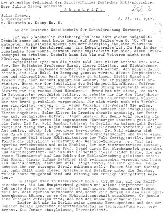 Einführung lichkeit an die deutsche Höhlenforschung damit beweisen, daß er in seiner bisher geübten Selbstlosigkeit seine Höhlenbücherei für die Fortsetzung der Forschungen zur Verfügung stellt". Das war der Gipfel des Zynismus. (...) In der Tat war geplant, alle Höhlenvereinigungen aus der noch bestehenden Dachorganisation herauszulösen, sie im "Reichsbund" gleichzuschalten und diesen dann der Forschungsstätte für Karst- und Höhlenkunde im "Ahnenerbe" unterzuordnen. Anfang 1939 konnte man die Aktion einleiten. Der ehemalige Studienprofessor Dr. Ing. Hans Brand wurde als der derzeitige Leiter der Karst- und Höhlenforschung im "Ahnenerbe" (...) im März beauftragt, mit den deutschen Höhlenwissenschaftlern persönlich Fühlung aufzunehmen. Reichsgeschäftsführer Sievers lieferte Schützenhilfe, indem er prominente deutsche Vereinigungen, wie den "Reichsverband deutscher Schauhöhlen und Schaubergwerke", schriftlich aufforderte, sich mit Brand zwecks "Zusammenarbeit" in Verbindung zu setzen. Unterdessen sorgte Dr. Kurt Willvonseder, des "Ahnenerbes" Vertrauensmann in allen Fragen der ostmärkischen Bodendenkmalspflege, dafür, daß auch die Neuordnung der zahlreichen österreichischen Höhlenvereine betrieben wurde. (...). In Österreich stieß das "Ahnenerbe" vorerst auf Widerstand, den er jedoch mit Gewalt zu brechen gedachte. Indem er einen Grazer Höhlenspezialisten im August 1939 zum "freiwilligen Eintritt in die vom Reichsführer-SS geschaffene Neuorganisation" unter Androhung einer Denunziation an Himmler drängte, legte er die nun schon längst zur politischen Typik des "Ahnenerbes" gehörende Haltung eines tyrannischen Zwingherrn an den Tag, der bemüht ist, nach außen hin sein Gesicht zu wahren. Gefügiger als die seit langem auf ihre ansehnlichen Höhlen stolzen Österreicher zeigten sich ihre deutschen Kollegen. "Hauptverbands"-Vorstand Riemer sah sich am 15. August veranlaßt, Sievers seiner Kooporation zu versichern." zurückführte, zum Vorwand, um für eine "völlige Angleichung" zumindest der traditionsreichen österreichischen Höhlenforscher an die Reichsverhältnisse einzutreten. Sievers pflichtete bei, doch war man sich über die Art der Gründung eines neuen "Reichsbundes" noch nicht schlüssig. Wie wollte man den "Hauptverband" eliminieren? (...). Schließlich befolgte das "Ahnenerbe" ... bundes" verfügen. 1942 informierte der "Reichsbund" seine Mitglieder, daß Riemer Anfang Oktober 1942 aus "gesundheitlichen Gründen" auf seine "Reichsbund"-Ämter verzichtet habe. Der wahre Grund, so ließ Riemer Florian Heller wissen, war jedoch die inzwischen vollbrachte Verhaftung des Nestors der deutschen Höhlenforschung, Benno Wolf, in Berlin. Das einzigartige höhlenkundliche Material Wolfs, welches das "Ahnenerbe" im Spätsommer 1942 gerade zu Brand nach München verfrachten ließ, aber gehörte laut Wolfs Vermächtnis - Julius Riemer. (...). Brand selbst erklärte nach dem Kriege, er sei in seiner Rolle als "Beschützer" Wolfs von der Gestapo "regelrecht überspielt" worden. Hingegen hat Julius Riemer nach 1945 gemeint, "daß der eigentliche Hauptschuldige für die Verschleppung Wolfs Prof. Dr. Brand sei, der sich in den Besitz des reichen wissenschaftlichen Materials zur Karst- und Höhlenforschung setzen wollte". Diese Feststellung kommt der Wahrheit am nächsten. Brand war es, der im Dezember 1940 an Sievers schrieb, durch die forcierte Annäherung Riemers an das "Ahnenerbe" werde man auf indirekte Weise in den "wertvollen Besitz des seit Jahren angehäuften und sorgfältig bearbeiteten Materials des früheren Hauptverbandsvorsitzenden Dr. Wolf gelangen". Im Oktober 1941, einen Monat, bevor die deutschen Juden überhaupt erst ihre deutsche Staatsbürgerschaft verloren, schrieb Sievers an Adolf Eichmann, nach der zu erfolgenden Deportation Wolfs sei dessen Material zu sichern und zum "Ahnenerbe" zu schaffen. Im Februar 1942 - die Berliner Juden wurden seit Oktober 1941 abtransportiert - regte Sievers an, die Bücherei Wolfs schon vor dessen Evakuierung durch die Gestapo beschlagnahmen zu lassen, ein Vertrauter des "Ahnenerbes" würde dabei gerne Hilfestellung leisten. Im April stand der ungefähre Zeitpunkt fest, zu dem der 71jährige Wolf "mit einem Alterstransport zum Abschub" gelangen sollte. Am 6. Juli war es endlich soweit. Vorsorglich hatte Sievers als "Ahnenerbe"-Spitzel die SS-Führer Dr. Abrahamczik und Reimann in die Berliner Hornstraße Nr. 6 entsandt. Ihr Bericht über die entwürdigende Verhaftung des einstigen Landgerichtsrats ist ein ebenso erschütterndes wie grausames Dokument. "Dr. Wolf erschien erst um 13.30 Uhr in seiner Wohnung. Vor den anwesenden SS-Männern wollte er vorerst keinerlei Aussagen machen und tat sehr geheimnisvoll über seine angeblichen Verbindungen zu aller- höchsten Stellen. Über seinen persönlichen Verkehr mit Riemer befragt, gab er zu, daß er fast täglich mit diesem beisammen sei. Über die plötzlich beabsichtigte Evakuierung war er sehr erstaunt, besonders da ihm von Herrn Riemer zugesichert sei, daß er von ihr verschont bleiben werde. Riemer wurde seinerzeit vom Reichsführer-SS als Vorstandsmitglied des Reichsbundes für Karst- und Höhlenforschung und Schriftleiter der Zeitschrift bestätigt. Auf Grund dieser Bestellung fühlte sich Herr Riemer nach Angaben Wolf's berechtigt, diesem zu raten, keinen Judenstern zu tragen. Es sollten dadurch seine Arbeiten am Welthöhlenkataster nicht behindert werden. Wolf schützte auch seine hohen Verbindungen vor und nannte als solche 'Das Ahnenerbe', Sievers, Rektor Wüst und Dr. Brandt." Das erste, was Reichsgeschäftsführer Sievers, der nach dem Kriege als Widerstandskämpfer in die Geschichte einzugehen gedachte, daraufhin tat, war, sämtliche Angaben Wolfs über dessen Beziehungen zum "Ahnenerbe" bei der Gestapo scharf zu dementieren. Im August bat Brand die Reichsgeschäftsführung noch einmal um Übersendung des Wolfschen Materials an seine Münchener Forschun