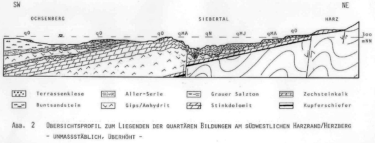 Das paläozoische Gebirge des Harzes, das das Arbeitsgebiet und damit zugleich das Gebiet größerer Mächtigkeiten der quartären Aufschüttungen des Vorlandes nach N und E abschließt, stellt zugleich das ausschließliche Liefergebiet dieser Schuttmassen dar. Aus diesem Grunde soll es hier detaillierter beschrieben werden. Es wird von den Flüssen und Bächen in konsequentem Tallaufe, d.h. im Streichen der paläozoischen Einheiten entwässert. Von NW nach SE treten folgende Einheiten - stratigraphisch und petrographisch zu beschreiben - auf: 3.1.1.1. Acker-Bruchberg-Zug Dieser bildet als Härtling (Quarzit) einen Höhenzug, der sowohl die verschiedenen Verebnungsflächen des Ober- und Mittelharzes überragt als auch unter Zechsteinbedeckung morphologisch und tektonisch noch nachweisbar bleibt: die Sieber-Söse-Wasserscheide am Paß der Papenhöhe, der selber noch bis zum Anstieg n' der Senke vom Werra-Anhydryt und vom Schuttfächer der Kl. Steinau bedeckt wird; letztere floß im älteren Quartär auf die jetzige Hochfläche von Düna, später zur Söse, spätestens seit der Zeit der Oberterrassenbildung aber zur Sieber. Der Acker-Bruchberg-Zug besteht aus hellen Quarziten, untergeordnet aus grau-bunten Kieselschiefern und schwarzen Lyditen. 3.1.1.2. Nach SW, im Entwässerungsgebiet der Gr. Steinau und des Rittersgrabens schließen sich mittel- bis oberdevonische Kieselschiefer, untergeordnet auch Tonschiefer an, die den Ausstrich älterer Einheiten der Siebermulde an deren NW-Flanke kennzeichnen. Sie liefern ein breites Spektrum von Adinolen und Lyditen, die zusammen mit ca. 4o % im Geröllbestand der zugehörigen Flüsse vertreten sind. Zunächst tektonisch damit vergesellschaftet folgen Grauwacken, untergeordnet Grauwackenschiefer des Kulms. Nur in der tieferen Anschnittslage des Rabentales nw' Mühlenbergs treten die Kulmtonschiefer auf. Das Zentrum der Siebermulde wird recht einheitlich von Kulmgrauwacken mit z.T. konglomeratischen Lagen aufgebaut. Es ist das Entwässerungsgebiet der Lonau und Sieber. Beide Flüsse reichen über Nebentäler in devonische Gesteine des randlichen Ausstrichs der Siebermulde hinauf. Die Lonau entwässert in diesem Sinne den SE-Abhang des Ackers und den nw' Muldenrand der Siebermulde, die Sieber im unteren Teil des Harzlaufes über das Langetal und Lindental den se' Muldenrand mit devonischen Kieselschiefern, Tonschiefern und untergeordnet mitteldevonischen Diabasen, der unterkarbonen Tanner Grauwacke und - quantiv unbedeutend - Gang- und Deckenporphyren des Rotliegenden (Gr. Knollen und zugehörige Förderspaltensysteme). Im oberen Talabschnitt entwässert das Siebertal zunächst das Devon w' Andreasberg und die nw' Flanke der Siebermulde mit oberdevonischen Kieselschiefern und mitteldevonischen Tonschiefern und Diabasen bis hinauf in den Acker-Bruchberg-Quarzit hart unterhalb vom Bruchberggipfel. Aufgeschlossen ist ebenfalls der Bereich des Brockengranites n' Andreasberg mit der Kontaktzone (Tonschiefer- und Grauwackenhornfelse). In sw' Bereich, am Rande des Harzes, sind die Gesteine der Siebermulde, besonders die Grauwacken und Tonschiefer infolge der Rotliegend-Verwitterung charakteristisch rot gefärbt. Sie finden sich regelmäßig in den Flußkiesen des Vorlandes mit geringen Anteilen. 3.1.1.3. Die Blankenburger Faltenzone und der Tanner Zug werden überwiegend zur Oder hin entwässert. Nur die im S-Teil der Blankenburger Faltenzone beginnenden Täler der Bäche Eichelngraben und Eichelbach münden bei Herzberg in die Sieber, der Eichelngraben schwenkte nach Akkumulation der qO über das Auetal in das Odertal. Neben Devon und Tanner Grauwacke führen beide besonders in der qO erhebliche Mengen an Rotliegend-Porphyren. Die Oder entwässert die Diabase und bereits genannten Gesteine der Blankenburger Faltenzone, des Tanner Zuges, den nw' Ausstrich der Südharz-Mulde (Südharzgrauwacke und Kieselschiefer des Oberdevons, Tonschiefer und Diabase des Mitteldevons und Kalklagen führende Tonschiefer des Unterdevons) und besonders das Gebiet Andreasberg mit relativ hohen Anteilen an Graniten und Kontaktgesteinen im Terrassenkies. Ganggesteine des Erzreviers treten hinzu. 3.1.1.4. Noch ungeklärt bleibt die Paläogeographie der rotliegenden Deckenporphyre. Ihr hoher prozentualer Anteil an den Kiesen der qO am Harzrand w' und e' Herzberg läßt vermuten, daß die Deckenergüsse, die nurmehr als kleine isolierte Reste vorliegen (Gr. und Kl. Knollen, Scheffeltalsköpfe) ehemals eine sehr viel größere Verbreitung innehatten. Sehr wahrscheinlich saßen auch dem südlichen der drei erzgebirgisch streichenden Förderspaltensystene, deren westlichstes Vorkommen die Mündung der Lonau in die Sieber quert, Deckenergüsse auf. Sämtliche Vorkommen dieses Spaltensystems sind jetzt nur noch in Tallagen angeschnitten, d.h. als Schlot bzw. Gang. Die Rotliegend-Landoberfläche, der ja die Ergußdecken auflagen, ist hier am Südrande des Harzes schon um mehrere Dekameter abgetragen. 3.1.1.5. Morphologie. Die Morphologie des Mittelharzes und seiner südlichen Abhänge ist von HÖVERMANN (1949) ausführlich beschrieben. 3.1.1.6. Jüngere Tektonik. Verschiedene Autoren beschreiben ausschließlich aus geomorphologischen Indikationen postulierte Hebungsphasen des Harzes während des Quartärs: Elbe-Elster-Interglazial (GRUPE 1915), Postglazial (HÖVERMANN 195o, PIEHLER 1969), Altpleistozän (THIEM 1972), Elsterkaltzeit (RICKEN 1973), langfristige epirogenetische Hebung des niedersächsischen Berglandes (LÜTTIG 1965, THIEM 1972). Im Rahmen dieser Arbeit erachte ich es als verfrüht, geologischen Nachweis oder Gegenbeweis liefern zu wollen. Der Zechstein hat auf die paläogeographische Entwicklung im Quartär des Harzrandgebietes einen hervorragenden Einfluß. Grundlage für Petrographie, Stratigraphie, Tektonik und Paläogeographie der Zechsteinschichten am sw' Harzrand ist die Dissertation A. HERRMANN (1953) inform des Manuskripts und die Manuskriptkarte der zugehörigen Kar