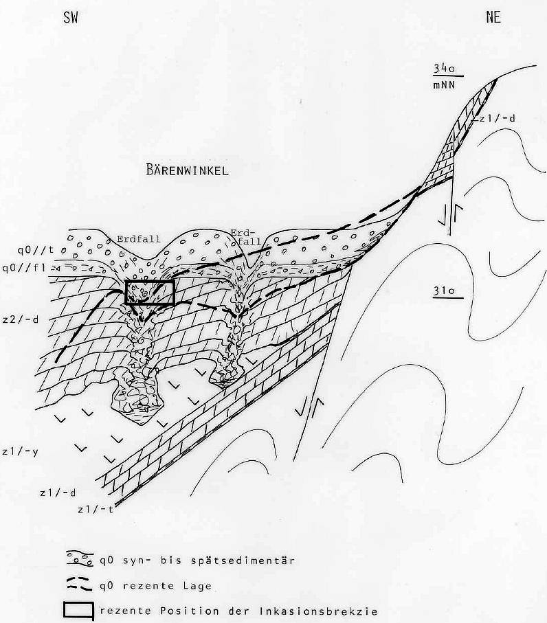 KRUEGER (1823)* beschreibt "Reste von Mammuth und Hyäne aus Mergeln bei dem benachbarten Herzberg". Der Begriff "Mergel" deutet darauf hin, daß die Funde in einer Mergelgrube gemacht wurden, hier ist einer der zahlreichen Erdfälle anzunehmen, die aus dem A1 durch den Ca2 durchgepaust sind. Denkbar wäre Hahnemanns Kuhle am SE-Anhang des Papenberges. Kalkgyttjen als Erdfallfüllungen, die ja ebenfalls als Mergelgrube hätten dienen können sind bislang nicht bekannt. Jedenfalls deutet der Hinweis "Mergel" darauf hin, daß ein stratigraphischer Bezug zu fluvialen Kiesen nicht wahrscheinlich ist. * KRUEGER, Geschichte der Urwelt, Bd. 2, S. 852; zitiert nach VIRCHOW, R. (1872). Das Wort "benachbart" bezieht sich auf die nähe Lage zu Scharzfeld. 3.3.1.4. Böden. Abgesehen von der holozänen Bodenbildung konnten ältere nur in vier Fällen wahrgenommen werden: im Liegenden der qO am Sieberufer w' Schloßberg (s. Abb. 6) und s' Amtmannsberg tritt eine Basisfließerde auf, in deren Basis an letzterem Orte eine Bodenbildung eingearbeitet worden ist (s. PS 16, 16a, 131). Auf dem Schinnacker sse' Mühlenberg (PS 96) findet sich eine ähnliche Bildung im Liegenden der qMA. Auch auf dem Top des Papenberges konnte in einer Basisfließerde der qO eine Bodenbildung beobachtet werden, die dort voraussichtlich mit eingeschuppt ist. Sie dürften mithin cromerwarmzeitlichen, im Falle des Schinnackers evtl. auch holsteinwarmzeitlichen Alters sein. Eine nähere Analyse konnte nicht durchgeführt werden. Auf älteren Flächen überlagert die holozäne ältere Bodenbildungen einschließlich Kryoturbationserscheinungen. Doch fehlten fast überall Aufschlüsse, die eindeutige Beobachtungen und strukturelle Untersuchungen zuließen. Auf die Verwitterungsverhältnisse der Terrassenkiese als Ausdruck von Bodenbildungen wurde bereits eingegangen. 3.3.2. Altpleistozän (exkl. Elster-Kaltzeit) Das Altpleistozän ist charakterisiert durch die episodische, tektonisch induzierte Tieferlegung der Fußflächen des Harzes bzw. der zugehörigen Täler als Erosionssysteme. Hiermit mag also während des jüngeren Tertiärs und älteren Quartärs eine diskontinuierliche Hebung des Harzes stattgefunden haben. Aus der geomorphologischen Entwicklung ist eine solche Hebung nach THIEM (1972) abzuleiten. Die Entwicklung von drei Fußflächensystemen, ihre genetische Abhängigkeit von der klimatischen Entwicklung, ihre Altersstellung und ihre tektonische Initiierung ist bei THIEM (1972, S. 2o7ff) sehr ausführlich geschildert und kann in der Form für unser Gebiet übernommen werden, zumal THIEM die Verhältnisse von Scharzfeld berücksichtigt. Auf eine Diskussion der z.T. ähnlichen Ergebnisse HÖVERMANN's (1949) kann hiermit verzichtet werden. Wie auch die schematische Auflistung der älteren Verebnungsflächen am Harzrand zeigt (s. Abb. 3), lassen sich mehrere Flächensysteme im Pleistozän des Arbeitsgebietes aushalten. Die Entwicklung eines Oberen Randverebnungssystems, ca. 1oo m der sicher alttertiären Harzhochfläche (6oo m NN) gegenüber eingetieft, wird - tektonisch in der ersten Hälfte des Pliozäns induziert - ins Oberpliozän gestellt (THIEM 1972, S. 214); nach HÖVERMANN (1949, S. 26) sind es die Höhen zwischen 44o und 48o m NN. Ein Mittleres Randverebnungssystem, dessen beginnende Entwicklung an die Wende Plio-/Pleistozän gestellt wird, liegt ne' Scharzfeld mit 39o m NN auf den Brandköpfen im Bereich der Einhornhöhle. Es fällt mit der Mittleren Randterrasse HÖVERMANN's zusammen und dacht sich nach NW über 36o - 365 m NN zwischen Scharzfeld und Herzberg auf ca. 35o m NN nw' Herzberg ab. Die nahezu 3o m höhere Lage der Brandköpfe könnte auf ihre mehr harzeinwärtige Lage zurückgeführt werden. Den Erosionsvorgängen auf dem Niveau dieser Fläche korrelate Sedimente stellen die Schotter der Einhornhöhle dar, die in 36o - 365 m NN in der Höhle liegen. Die Kiese, im Liegenden der rhumewarmzeitlichen (Cromer-Komplex) Wirbeltierfauna (ursus deningeri und thermophile Begleitfauna, SCHÜTT 1968) werden von DUPHORN (1969, S. 89) als kaltzeitlich gedeutet und in eine präcromerzeitliche Kaltphase des Altquartärs gestellt. Die petrographische Zusammensetzung der Kiese der Höhle (ders., S. 87; s.a. GA 98) soll hier wie folgt gedeutet werden: nur 2,5 km ne' der Höhle stehen im Gebiet der Scheffelstalköpfe Deckenporphyre und deren noch rotliegendzeitliche Umlagerungsprodukte an. Sie werden jungpleistozän bis rezent durch das Gr. Andreasbachtal mit den Ilthorntal entwässert. Westlich des Kl. Mittelsberges und ese' des Herbstberges bricht der jetzige Talverlauf in charakteristischer Weise aus dem Streichen des Grundgebirges aus und schwenkt nach SE. Ähnliche Verlagerungen zeigen die Gr. Steinau, die Lonau und der Eichelngraben. Unter der Annahme einer altpleistozänen Entwässerung der Scheffeltalsköpfe über das Mittlere Randverebnungssystem zu den Brandköpfen läßt sich die petrographische Zusammensetzung der Höhlenschotter zwanglos, nämlich als lokales Erosionsprodukt deuten. Wie sich geometrisch leicht rekonstruieren läßt, war das relative Verbreitungsgebiet des Rotliegenden, hier der Porphyre, zu dem Zeitpunkt erheblich größer (s. Abb. 4).