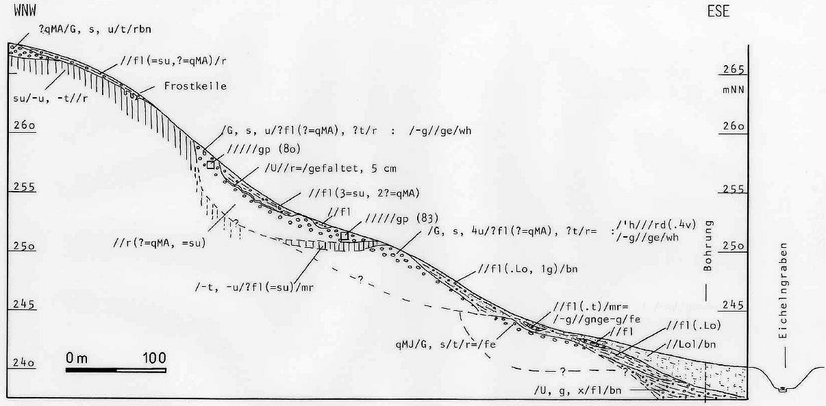 Die durch Sondierungen gewonnenen Aufschlüsse stellen qualitativ die Hauptergebnisse dieser Arbeit dar. Die Sondierergebnisse finden sich als Schichtenverzeichnisse im Anhang (6.5.) und sind in Profilform überwiegend auch zeichnerisch dargestellt. Unabdingbar für die Zuverlässigkeit von Sondierungen mit der Peilstange bzw. Nutsonde ist die Kenntnis von systematischen Fehlern des Bohrvorganges. Die Schichten werden in Abhängigkeit ihrer Petrographie (bindig, rollig) in der Nut verschleppt. Die Ausbildung der Spitze der Nut (offen, geschlossen) und der Form und Kalibrierung der Nut (zylindrisch, konisch) führt bei gleichem Bodenaufbau zu stark veränderten Profilen in der Nut. Auch die Vortriebsart (Einzelschlag, Einvibrieren) sowie die relative Lage zum Grundwasserspiegel muß berücksichtigt werden. Eine sehr detaillierte Übersicht über diesen Problemkreis liefert ALBRECHT (1969) 2.3.1.1. Flache Sondierungen Vorgesehen waren im Rahmen der Aufgabenstellung als Ergänzung zur geomorphologischen und als Technik der geologischen Kartierung fallweise Handsondierungen im Sinne der "preußischen 2 m Kartierung". Verwendung fand hierbei ein einfacher Gerätesatz aus dem Geologisch-Paläontologischen Institut Hamburg von folgendem Aufbau: 22 mm - Gestänge, 22 mm - Nutsonden (geschlossen, 1 m), Kunststoffhammer und Froschklemme als Hebegerät. Bei einer Bedienungskraft konnten in Mittel 3 m, maximal 6 m Bohrteufe in den festen Bodenarten erreicht werden. Auf den geologischen Aufbau bezogen kamen diese Sondierungen im Löss bzw. in den oft viele Meter mächtigen Fließerden zum Stehen. Im späteren Verlauf der Geländearbeit wurde dieser Gerätesatz zur 1 - 2 m tiefen fallweisen Auskartierung des Lösses und weiterer Deckschichten der Oberfläche herangezogen, wozu sich das Gerät infolge seiner hohen Transportabilität (eine Schulter, eine Hand) gut eignet. Als nachteilig erwies sich eine relativ hohe Verlustrate von drei Brüchen des Gestänges auf insgesamt 163 Bohrmeter. In allen drei Fällen konnte das immer in 1 - 1,1 m Teufe gerissene Gestänge durch Ausschachten geborgen werden, was zusätzliche Aufschlüsse vermittelte. Die Brüche in Höhe der Gewindenippel treten, wie sich später feststellen ließ, typischerweise beim Ziehen mit der Froschklemme auf, indem bei diesem Gerät das Gestänge beim Ziehen unter Spannung aus der Lotrechten verkantet wird. Auch der nicht immer axial treffende energiereiche Schlag des Kunststoffhammers führt infolge Auftretens von Transversalschwingungen im Bereich der unter Spannung stehenden Gestängeverbindungen als vornehmliche Schwächezonen zu diagonalen Beanspruchungen, die besonders bei weichen Gesteinen zu Brüchen führen, indem hier das Bohrloch leicht geweitet wird und damit transversalen Schwingungen Platz gegeben wird. Ein solcher Fall trat schon bei einer Sondierung von nur 2 m Teufe im Löss auf. 2.3.1.2. Tiefe Sondierungen Nachdem im Laufe des Kartierfortschrittes erkennbar wurde, daß ohne Erfassung des räumlichen Baues keine effektiven Fortschritte erzielt werden konnten, wurden alle Sondierarbeiten mit einem Motorgerät fortgesetzt. Dieses wurde vom NLfB in Hannover zusammen mit der Bezahlung einer wahlweisen Hilfskraft dankenswerterweise zur Verfügung gestellt. Der Gerätesatz hatte folgenden Aufbau: Pürckhauer-Sonde (konisch, 1 m) zum flächenhaften Kartieren und zum Vorbohren des ersten Meters für tiefere Sondierungen, 22 mm - Nutsonde (geschlossen, 1 m). 2 x 22 mm - Nutsonde (geschlossen, 2 m), - 22 mm Verlängerungen, Wacker-Brennkrafthammer BHF 25 K, dreiteilige Kugelklemmen-Ziehvorrichtung der Fima Stitz/ Benthe. Bei zwei Bedienungskräften könne mit diesem Gerät 4o - maximal 5o Bohrmeter am Tag (ca. 5 m/h) erreicht werden. Bei insgesamt 341 Bohrmetern mit diesem Gerätesatz bis zu 14 m Teufe traten keinerlei Verluste oder irreversible Schäden am Gerät auf. Dies ist eindeutig darauf zurückzuführen, daß erstens beim Vortrieb mit dem Motorhammer das Gestänge immer streng axial beaufschlagt wird und zweitens durch das verwendete Hebegerät das Gestänge wiederum streng axial herausgeführt wird. Spätere Erfahrungen legten es nahe, nach technischer Möglichkeit nur mit offenen Spitzen zu arbeiten, da hierbei die Verschleppungsbeträge geringer und Feinschichtung besser erhalten werden. Auch beim Festsitzen des Gestänges konnte mit stark verlängertem Hebelarm das Gestänge sogar bei Zug dreier Personen bruchfrei gehoben werden. Bewährt hat sich der Transport des Gerätes (gut 1oo kg) in einem geländefreundlichen Fahrzeug, so daß ohne lange Tragezeiten an allen jeweils aus geologischen Gründen günstigen Orten gebohrt werden konnte (Wald, Acker etc.). Es zeigte sich bei den Bohrarbeiten, daß die wissenschaftliche Qualität der Arbeit in deutlicher Abhängigkeit von der physischen Belastung durch die mechanische Arbeit steht. Mithilfe dieser Ausrüstung konnten grundsätzlich bessere Ergebniskategorien gewonnen werden, weil es möglich wurde, die Sondierungen bis in die groben Terrassenkiese selbst auszuteufen und somit die Terrassenoberflächen wie auch die Lagerungsverhältnisse der Lösse und Fließerdefolgen räumlich zu erfassen und in günstigen Lagen sogar die Quartärbasis zu erreichen. Gelegentlich konnte sogar die stark verwitterte qO vollständig durchteuft werden. Sämtliche tiefere Sondierungen wurden gegen NN einnivelliert. Die tieferen Peilstangensondierungen ließen sich hervorragend mit Bohrungen verbinden, die im Bereich des Arbeitsgebietes bereits vorlagen. Hierbei waren zwei glückliche Umstände zu verzeichnen: erstens der Neubau der B 243 von Osterode über Herzberg nach Scharzfeld mit der Anbindung der B 27, die über das Auetal nach Herzberg führt. Die Trassen wurden in geringen Abständen drei Meter tief abgebohrt, Brückenbauwerke 1o - 15 m tief. Die Schichtenverzeichnisse konnten im Straßenneubauamt in Osterode dankenswerterweise eingesehen und z.T. kopiert werden.* Zweitens kam hinzu