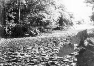 Abb. 3: Dieser dreifach überhöhte und etwas geknickte Schnitt durch den Schlossberg von der Sieber über den Mühlengraben (M) im Norden zum Ochsenpfuhl (E) im Südosten des Schlosses stellt seinen geologischen Bau dar. Man erkennt die Schotterfüllung (S) der Siebertalaue und beidseits vom Ochsenpfuhl, die Verkarstung des "Werraanhydrits" (WA), die Klüfte, Höhlen (schematisch angegeben) und sich talwärts neigenden Randbereiche der "Hauptdolomit" (HD)- Platte unter dem Schloss. Schlängelpfeile geben schematisch den Weg der Sickerwässer an. Gerissene Pfeile weisen auf die tendentielle Hangzerreißung hin, DB = Bahnlinie. Dolomitfels ist in geringem, Anhydrit und Gips hingegen in recht hohem Maße (bis etwa 2 g CaSO4/l) wasserlöslich. Die spröden Dolomitschichten wurden im Zuge der Heraushebung und Verkippung des Harzes (hier ca. 5° nach SW) engständig zerklüftet. Dadurch kann die - geologisch gesehen rasche - Auflösung dieser Zechsteinschichten nicht nur nahe der Geländeroberfläche, sondern auch in Tiefen von vielen Zehner Metern, als sog. Subrosion, erfolgen. Dabei bildet sich durch die sog. Verkarstung eine typische Landschaft mit Höhlen, erweiterten Felsspalten, Erdfällen, Dolinen usw. heraus. Die Sieber - mit einem Einzugsgebiet von 84 kmē im niederschlagsreichen Harz oberhalb von Herzberg - erzeugt, ebenso wie die Söse bei Osterode und die Oder unterhalb von Bad Lauterberg, eine besonders intensive Verkarstung der Anhydrit- und Dolomitschichten. In Verbindung mit einer Tieferlegung der Landoberfläche um bis zu mehrere Meter durch "Subrosion" gestaltet diese Verkarstung die hiesige Zechstein-Landschaft seit den Eiszeiten wesentlich mit. Große Mengen besonders von Sieber- und Oderwasser versickern durch den klüftigen, karstigen Zechstein und strömen durch den Untergrund des Pöhlder Beckens innerhalb von 2-3 Tagen der Rhumequelle zu. Diese große Karstquelle (160 m ü. NN) liegt 7 km südlich von Herzberg und knapp 70 m unter dem Herzberger Sieberbett. Dabei unterströmt ein großer Teil des Sieberwassers den klüftigen, offensichtlich von Höhlensystemen durchzogenen Werraanhydrit und Zechsteinkalk im Untergrund des Herzberger Schlossberges (siehe MOLDE, 1998). Zwischen Schlossberg und Nüllberg fließt die Sieber, wenn sie nicht in trockenen Monaten vollständig versickert (Abb. 4), auf mächtigen Schottern, die sie aus dem Harz herabtransportiert hat. Diese nacheiszeitlichen Grauwacke-, Quarzit- und Kieselschiefer- Geröllmassen füllen den durch Subrosion (unter der Oberfläche erfolgende Gesteinsauflösung) stark eingetieften Talzug im Bereich der oberflächennahen Zechstein-Anhydrite und -Dolomite zwischen Herzberg und Hörden.