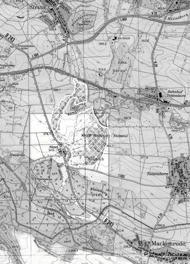 Abb.: 89 Renaturierungsbereich Steinaaltarm 12.15.2 Minimal- und Maximal-Varianten Im folgenden sollen zwei konkretere Umsetzungsvorschläge geliefert werden. Beide Varianten haben grundsätzlich zum Ziel, die ursprünglichen Verhältnisse der Karstdynamik durch den Einbau eines Streichwehres im jetzigen Steinaverlauf neu zu initiieren. Sie unterscheiden sich jedoch in den Ausmaßen des Eingriffes und den zu erwartenden Auswirkungen.Die Minimalvariante beschränkt sich auf den notwendigsten Eingriff zugunsten einer Renaturierung. Um dem alten Steinabett wieder Wasser zuzuführen, kann ein Streichwehr an der Biegung des Baches eingebaut werden (siehe Abb. 89 Renaturierungsbereich Steinalatarm). Das Streichwehr sollte gleichlaufend zur Fließrichtung angeordnet werden. In den Wasserlauf eingebaut, leitet es einen Teil des Wassers in den noch auszuhebenden Nebenlauf ab. Eine Mindestwasserführung durch die Steina muss für die Ichte jedoch immer durch das Wehr gewährleistet sein, d.h. nur überschüssige Wassermengen werden in den Nebenlauf abgeleitet. Der jetzige linke Uferverlauf der Steina deutet ein Prallufer an, was den Einbau des Wehrs in seitlicher Böschung und das Umleiten in den Nebenlauf an dieser Stelle aus strömungsbedingten Gründen begünstigt. Für den Einbau eines Streichwehres stehen hier eingegrenzt durch jeweils ein zu erhaltenes Gehölz entlang des Steinaufers ca. 8,5m zur Verfügung. Für eine genauere Beschreibung der "Baumaßnahme Streichwehr", inklusive Baumaterial, Erdaushub und technischen Angaben bedarf es weitgehender Informationen bezüglich der repräsentativen Steinaabflüsse, da das Wehr in erster Linie danach dimensioniert werden muss. Der Gewässerrandstreifen erfüllt mit einer Breite von ca. 2-4m auf beiden Seiten nicht die Forderungen des LRP. Im Zuge einer Renaturierung sollte der Gewässerrandstreifen auf eine Breite von 10m ausgeweitet und gemäß §91a NWG umfangreich gesichert und entwickelt werden. Im Bereich des Wehrs muss die aufgeschüttete Böschungssicherung entfernt werden. Ein naturnaher Auwald, sowie die Anpflanzung von Erlen und Weiden als natürliche Ufersicherung sind gemäß § 93 NWG hier anzustreben. Weiterhin bietet ein ausreichend breiter Uferrandstreifen wertvollen Lebensraum für spezifische Flora und Fauna. Die Ansiedlung hygrophiler (feuchtigkeitsliebender) Laufkäfer, verschiedener Schnecken-, Heuschrecken-, Schmetterlings- und Spinnenarten wird somit gefördert. Durch eine Regeneration von Bachauen werden die Entwicklung und Erhaltung ungestörter Hochstaudenfluren mit angrenzenden blütenreichen Feuchtbrachen gefördert sowie die Lebensräume sämtlicher hygrophiler Arten gesichert. Darüber hinaus stellen ungestörte Gewässerrandstreifen und ihre Auen grundsätzlich ein bedeutendes Element des Landschaftsbildes dar. Der parallel zum Fließgewässer angelegte Land- und Fußweg muss für die Etablierung des Uferrandstreifens zur Verfügung gestellt werden und aus jeglicher Nutzung ausgenommen werden. Die Umlenkungsstrecke hin zum alten Steinabett beträgt ca.10m. Sie würde den bisher angelegten Fußweg kreuzen und auch den Landweg in Richtung nördlicher Anhöhe unzugänglich machen (siehe Abb.89 Renaturierungsbereich Steinalatarm). Der Höhenunterschied zwischen jetziger Steinaflußsohle und der Mulde des alten Steinaflußbettes beträgt an der voraussichtlichen Schnittstelle nur wenige Zentimeter, nimmt jedoch im Verlauf des alten Flußbettes zu. Folgende Maßnahmen sind bei der Wiederherstellung des alten Flussbettes durchzuführen (vgl. Busch 1965). Nach einer Wasserfüllung der alten Steinamulde sollte die Überschwemmung durch einen Überlauf im östlichen Teil der Mulde auf die große Fläche westlich des Nussteiches ausgeweitet werden. Es ist zu erwarten, dass bei Hochwasserereignissen der Fitzmühlenbach auch entsprechende Wassermengen in Richtung Nussteich transportiert. Demnach wäre eine Überschwemmung des Nussteichgeländes aus zwei gegenläufigen Richtungen gewährleistet, wobei sich die Aufstaurichtung nach Westen hin beläuft. Aufgrund des Geländereliefs würde das Wasser jedoch lediglich bis ca. 2/3 der Fläche gen Westen ansteigen, denn eine Anhöhe auf der Fläche parallel zur B243 erfüllt hier die Funktion eines Damms. Durch die Überschwemmung der Fläche westlich des Nussteiches wird eine große Retentionsfläche wiederhergestellt. Die Randbereiche dieser temporären Überflutungsfläche würden wertvolle Rückzugslebensräume für spezialisierte hygrophile Arten sowie bedeutsame Sommerlebensräume für verschiedene Amphibienarten und die Ringelnatter darstellen. Der Nussteich, als eigenständiges Biotop, bleibt bei der Minimalvariante unberührt. Im Rahmen einer ganzheitlichen Renaturierung sollte das komplette Gelände um den Nussteich aus jeglicher Nutzung (Grünland, Fischerei) ausgenommen werden, denn dies entspricht dessen ursprünglichem Zustand. Die Maximalvariante beinhaltet alle Maßnahmen und Planungen der Minimalvariante, wird jedoch durch einige weiterführende Eingriffe ergänzt. Diese haben zum Ziel, konsequent den ursprünglichen Zustand auf dem Nussteichgelände wiederherzustellen. Das bedeutet, dass über die Umlenkung der Steina inkl. Einbau der Überläufe hinaus, die Nussteichschwinde wieder freigelegt und die natürliche Vorflut der Steina in die Nussteichschwinde wiederhergestellt werden soll. Der derzeit künstlich aufgeschüttete Damm am Fuß der Gipsfelswand sollte rückgebaut werden. Nur so kann ein Verschwinden des Wassers in den ober- und unterirdischen Karstgängen des Gipsgesteins erneut in vollem Ausmaße gewährleistet werden. Es können jedoch derzeit keine Aussagen über die Auswirkungen der Herstellung dieser ursprünglichen Verhältnisse getroffen werden. Die Anzahl sowie die Größe der Schwinden in der Gipsfelswand sind nicht eindeutig nachzuvollziehen und werden sich voraussichtlich im Laufe der Zeit in ihrem Zustand und Verhalten ändern. Dennoch ist die Wi