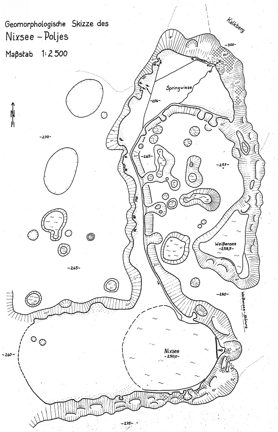 Abb.: 74 Lageplan der Springwiesen-Quellen (Haase 1936, 30) Die auf der Abbildung 74 Lageplan der Springwiesen-Quellen eingetragenen Quellen S1 bis S7 lassen sich aufgrund ihres Schüttungsverhaltens in zwei Gruppen einteilen. An den Quellen S1 bis S4 lassen sich sehr große Schwankungen von völliger Austrocknung bis kräftiger Ergiebigkeit beobachten. Die Quellen S5 bis S7 haben hingegen eine geringe aber stetige Wasserführung. Die Quellen S5 bis S7 liegen nahe am Fitzmühlenspring. Ihre Wassertemperaturen sowie der Chemismus lassen vermuten, dass diese drei Quellen ebenso wie der Fitzmühlenspring aus dem „Kalkberg“ gespeist sind Die Quellen S1 bis S4 werden vermutlich hauptsächlich durch unterirdische Zufuhr von der Steina versorgt. Haase (1936) hat in seinen Untersuchungen einen Zusammenhang zwischen Niederschlag, Wasserführung der Steina und Quellschüttung nachgewiesen (Haase 1936, 30-35). Der Fitzmühlenspring wird hauptsächlich aus dem Höhlenbach gespeist, der zum einen aus dem Bach der Trogsteinzuflußhöhle und zum anderen aus dem Zehngärtenbach in die Große Trogsteinschwinde einfließt. Ein Anteil von Steinawasser am Fitzmühlenspring konnte als Zugang im unbekannten Gerinneteil unterhalb der Großen Trogsteinhöhle nachgewiesen werden (Haase 1936, 39) Die verschiedenen Quellen vereinigen sich zum Fitzmühlenbach und fließen durch ein Tal nach Süden. Auch hier entspringen mehrere Wiesenquellen. Der Bach mündet nun in den Nussteich. Dieser Teich befindet sich in einer circa 400 m x 200 m großen Hohlform. Am Ostende dieses Beckens befindet sich ein Ponor (Schluckloch). Normalerweise würde das Wasser an dieser Stelle wieder verschwinden. Jedoch wurde der Nussteich durch einen Damm vor dem Ponor künstlich aufgestaut (Duckeck, 2002: Showcaves of the World. Nixseebecken. auf: http://www.showcaves.com/english/de/karst/Nixseebecken.html). Der Zeitpunkt der Errichtung des Dammes ist unklar. Der Eigentümer des Nussteiches, Herr Rennschuh (Göttinger Hotellier aus Walkenried), schätzt den Zeitpunkt auf 1913. Andere behaupten, der Damm existiere schon Jahrhunderte und sei ggf. durch die Zisterzienser aus Walkenried entstanden. Wieder andere sagen, der Damm sei nach dem Kriege errichtet. Ein Luftbild vom April 1945 zeigt zwar kein Wasser, dies wurde jedoch möglicherweise auch wegen Fliegerangriffsgefahr abgelassen. Hier ist also noch historische Forschung gefragt. Laut Haase (1936) muß der Damm schon vor 1933 existiert haben, er beschreibt eine im Sommer 1933 durchgeführte Säuberung des Nixseebeckens. Laut dem Heimatforscher Chr. Baumann galt der Teich schon in einem Rezess von etwa 1814 als "lange genutzt". Wahrscheinlich in dem Sinne, daß der Damm, er liegt ja in einer Senkungszone, schon sehr alt ist und sukzessive alle paar Jahrzehnte nach geschüttet wurde (frdl. mdl. Mitt. Herr Vladi). Die gesamte Hohlform des Nussteichbeckens befindet sich in einer Ebene, die mehrere Dolinen aufweist. Einige davon sind mit Wasser gefüllt. Die größte ist der Weißensee. Sehr interessant ist die Tatsache, daß der Wasserspiegel des Weißensees 10 m höher ist als der Ponor, obwohl er sich nur 100 m entfernt befindet. Dies weist darauf hin, daß sein Wasser in einem unabhängigen Kreislauf zirkuliert. Die Entstehung des Nussteichbeckens hat zwei mögliche Ursachen. Entweder handelt es sich um ein teilweise eingestürztes Höhlensystem, dessen noch existierende Teile die verschiedenen Quellhöhlen und den Ponor darstellen, oder mehrere Dolinen, wie auch der Weißensee eine ist, sind im Laufe der Zeit zusammengewachsen (Duckeck, 2002: Showcaves of the World. Nixseebecken. auf:http://www.showcaves.com/english/de/karst/Nixseebecken.html). Das Wasser der Nussteichschwinde mündet laut Haase möglicherweise im Salzaspring in Nordhausen. Nach einer neueren Studie aus DDR-Zeit mündet nur ein Teil dieses Wassers dort. Der andere Teil des Wassers, wobei unklar ist wieviel, soll ohne klaren Austritt nach Ostsüdost mit einem Tiefengrundwasserstrom in das Unstrutgebiet abgehen (frdl. mdl. Mitt. Herr Vladi).
