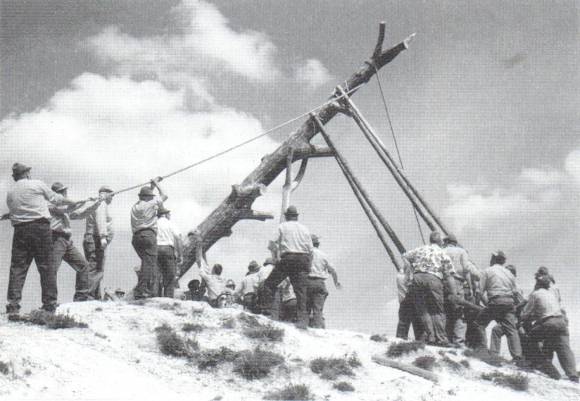 „Erstlich versammelte sich jährlich am Tage vor Himmelfahrt und ging sämtlich nach dem Walde, um den besten Baum darin auszusuchen...“ Über das Auswechseln des Stammes und über den oben befindlichen Hahn zitiert Jugler aus Keyssler, Reysen II (Hannover 1741; S. 76, Fußnote): „Nach Keyssler (a.a.O. S.1378 f) setzte man keinen neuen Kreuzbaum eher, als wenn der vorige Alters halber gefallen war. Man wählte dazu die schönste und beste Eiche. Kein anderer Baum durfte dazu gebraucht werden. Er konnte auch nicht mit Pferden, sondern mußte bloß mit Ochsen angeführt werden.“ Das Gegenstück des Kreuzbaums war der Kronenbaum, über den Jugler wieder Domeier zitiert (S.78): „Den Kronenbaum hielten die Wenden ... auch in großen Ehren. Die Figur desselben war rund, dergestalt, daß dem Baume bis zum Gipfel alle Äste abgenommen, die Rinde abgestreifet und die oberen Zweige wie eine Krone zugehauen wurden. Gleichwie bei der Errichtung des Kreuzbaumes die Männer alle Handarbeiten verrichteten, also taten es bei dem Kronenbaume die Weiber, und zwar mit folgenden Ceremonien. Erstlich wurde derselbe jährlich den Tag vor Johannis von den Weibern einer jeden Dorfschaft ausgesucht, gefället und zurechtgehauen. Am folgenden Johannistage nahmen die Weiber einen Wagen, spannten sich selbst davor und zogen also nach dem Walde zu, allwo sie ihn aufluden und nach seiner Stätte brachten....Sobald nun solcher an der Stätte des Kronenbaumes anlangte, wurde der alte umgeworfen, der neue aber, nachdem er mit Blumen und Kränzen behangen war, an dessen Statt mit Jauchzen und Frohlocken wieder aufgerichtet; worauf dann alle und jede dem in der Bauernstube angestellten Sauffeste zueilten.“ Über die Ausrottung der Kronenbäume berichtet Leibniz, der sich auf G. F. Mithofs „de lingua Winidorum Luneburgensium“ (1695) beruft, in seinen Collectanea etym. (Hannover 1717; S.76 u. S. 85, Fußnote): „Zwanzig Jahre später 1691 standen noch in etlichen Dörfern die hohen Kreuzbäume, wiewohl die Kronenbäume nicht mehr vorhanden waren. - (S. 85) Sonsten befinden sich annoch in etlichen Dörffern die hohen Creutz-Bäume, wiewol die Cronen-Bäume meines Wissens nicht mehr vorhanden; welche vor alters von den Wenden mit gewissen solennen Ceremonien gehauen, angeschleppet und auffgerichtet; auch an sonderlichen hiezu benandten Festen mit Kräntzen seyn beehret, wobey weydlich gesoffen worden.“ Dies wird bestätigt durch die Erinnerungen eines wendischen Bauern, Johann Parum Schultze, der eine handschriftliche Chronik des Dorfes Süthen hinterließ8. Jugler teilt daraus folgendes mit (S.79): „Da ich noch ein Knabe war9, da stunden in allen Dörfern hohe lange aufgerichtete Bäume, oben ein Querholz, gleich einem Kreutze, ganz oben eine eiserne Stange mit einem Wetterhahne, von unten auf zwey Seiten mit hölzernen langen Nageln eingeschlagen, dass man konnte oben bey dem Hahn hinaufsteigen...“ Soweit die hier interessierenden Textzitate. Sieht man von Details ab, so drängen sich doch viele Parallelen zur Queste und dem damit verbundenen Volksfest auf. Für den „Kreuzbaum“ wie für die Queste wird die beste Eiche gefällt. Sie wird nicht einfach an die Stätte gefahren, wo sie aufgerichtet wird, sondern sie muß unter Beachtung gewisser Bräuche transportiert werden: im Wendland dürfen die Zugtiere nicht die üblichen Pferde sein, beim Kronenbaum spannten sich die Weiber vor den Wagen; in Questenberg wird der Stamm von den Männern getragen. Besonders die Beschreibung des Kronenbaums erinnert an den Questenstamm mit seinen stehengebliebenen Astansätzen und der abgeschälten Rinde (Abb. 1). Die Bäume wurden mit Kränzen geschmückt, allerdings waren es anstelle eines großen Kranzes wie bei der Queste offenbar mehrere kleinere. Das Querholz, das J. P. Schultze erwähnt und an dem wohl diese Kränze aufgehängt wurden, erinnert an den Querbalken der Queste. Ein Symbol sehe ich weder hier noch dort; der Querbalken war einfach zum Aufhängen der Kränze bzw. des Kranzes notwendig (Abb. 2).  Abb. 2: Pfingsten 1991: Aufziehen des Kranzes