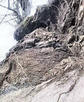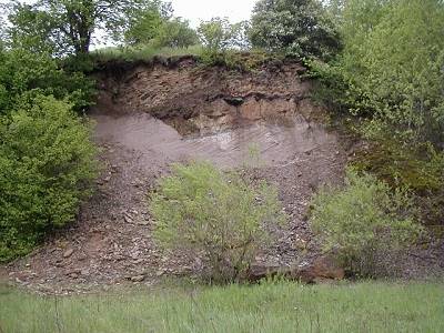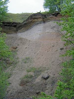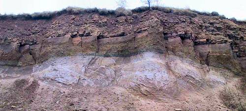 Eindrucksvoll aufgeschlossen sind die Schrägschichtung der Sande und die späteren Verwerfungen.